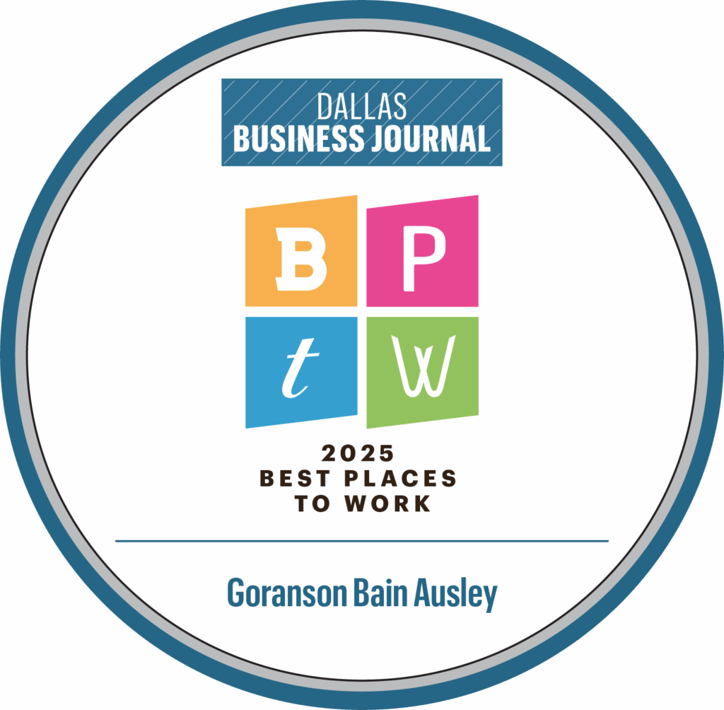 Goranson Bain Ausley has been named a Top Workplace by the Dallas Morning News and recognized as a Best Place to Work by the Dallas Business Journal and Austin Business Journal.